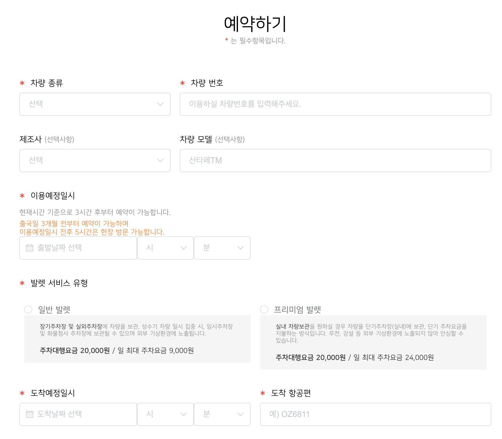 예약하실 수 있고 차량정보와 출국/귀국 정보 입력하시면 됩니다.